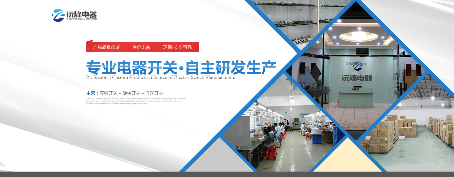 佛山市順德區(qū)沅烽電器有限公司是一家自主研發(fā)及生產(chǎn)各種電器開關以及接線端子座企業(yè),產(chǎn)品主要有浮球開關、琴鍵開關、旋轉(zhuǎn)開關、微動開關、按鍵開關等系列,產(chǎn)品廣泛應用在空調(diào)、電風扇、電飯煲、電暖器、電烤箱、微波爐、榨汁機、攪拌機等家電行業(yè)。 本公司提供產(chǎn)品從設計開發(fā)到制造檢驗及跟蹤服務的全部流程,自主擁有模具設計制造、自動沖壓、精密注塑成型及組裝等部門。公司不斷完善檢測體系并引進高精度檢測儀器,其中有被美國安全試驗檢驗公司即UL公司認可的安規(guī)實驗室。 本公司于2003年通過并實施ISO9001國際品質(zhì)管理認證體系,產(chǎn)品相繼獲得CQC、CE、TUV、UL認證,同業(yè)內(nèi)眾多知名企業(yè)如美的、TCL、海信科龍、格蘭仕等保持長期的合作關系,有部分產(chǎn)品出口多個國家。 我們堅持走專業(yè)化的道路,以一流的產(chǎn)品及服務答謝客戶,愿與各界朋友共創(chuàng)美好明天...        查看更多